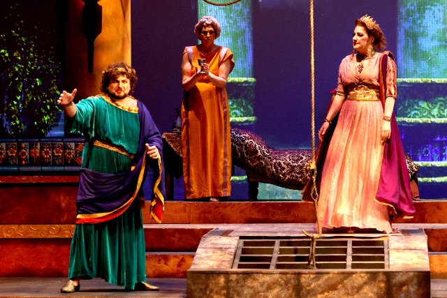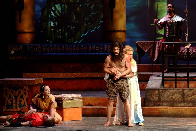 Another potential staging issue concerns the offstage singing of Iokanaan, as any singing behind the scenes can get lost. To begin with, Nathaniel Sullivan as Iokanaan has a strong and agile voice and when bedecked for it, fits the part well (i.e., in real-life he appears more a Clark Kent, but he transforms into a primitive-looking Superman type). The solution is that rather than singing from the wings, he sings from the cistern in the middle of the stage in which he is imprisoned. He also uses a homemade, unamplified megaphone, so that he comes through loud and clear.