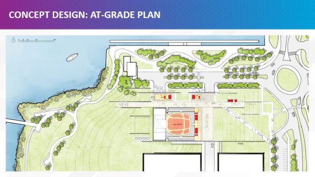 - Parking: Two multi-level parking garages, now proposed adjacent to and south of the main theater, will provide approximately 750 parking spots, to be used both by theater patrons and park visitors. Under the current concept, one is three levels tall, the other four. There is also room for 50 to 70 ADA-compliant (handicapped) spaces near the theater but underground and a potential 120 additional spots a short walking distance away in front of the “cultural district.” The Foundation believes this will be adequate for “most” activities, but discussions continue about additional parking spots on and off the park site.