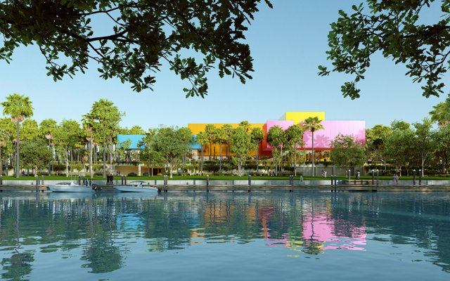 - Location: The proposed main theater, previously located on the north side of the 10th Street boat canal, is now on the south side of the canal and adjacent to Tamiami Trail, with a buffer of green space between them. Two other structures — a “multipurpose” space and a “donor lounge” — are located just north of the performing arts center (but south of 10th Street) with a long walkway and additional green space between them and the main theater.