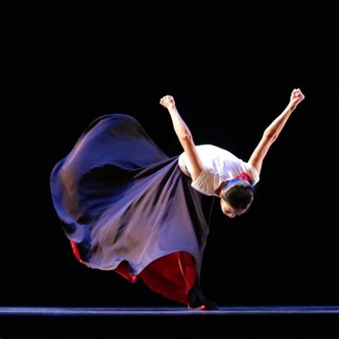 In a long black skirt with a red interior glimpsed with movement like flashes of blood, Xin Ying captured Graham’s signature style, displaying both a remarkable flexibility and a determined rigidity against unseen forces determined to take her down. At one point, with bent knees she goes into a backbend that takes her all the way to the ground, like someone performing an extreme limbo. Yet she continually fights her way up, reflecting Graham’s belief in remaining upright despite violation. Her halting, but dogged steps forward at the conclusion seemed almost inspirational.