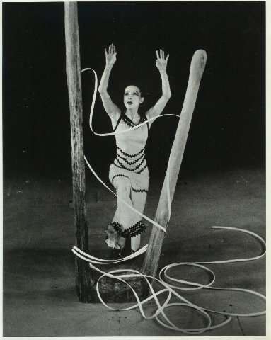 In a floor-length white dress, with sharply angled, staccato movements, Smith picks her way in relevé along a cord that weaves an erratic path on the floor, off and on struggling with Leone, who dances the entire piece with his face covered by a mesh hood and his arms held in a goalpost position by a long wooden bar behind his neck and nestled in the crooks of both elbows. In the end, she appears to vanquish him, her high battement kicks evidence of her triumph.