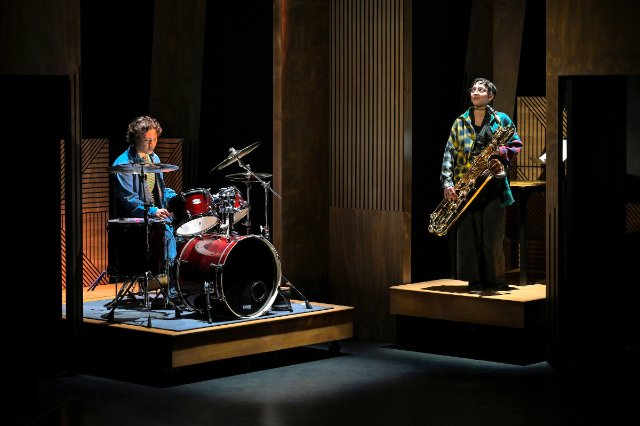 Laudably, ||:GIRLS:||….. reflects its intellectual power throughout with its aspiration to educate along with entertaining, and it particularly benefits and suits a younger audience with a serious interest in music.  But as a stage drama it could use more cohesiveness.  As somewhat a gimmicky prelude to the action, 12 audience members select 12 keys from a piano on stage, a random outcome, and music is composed and performed by the actor/musicians using only those notes.  And while this device is instructive and even interesting, it deflects from dramatic impact of the story line.  The play tries to be too many things that are out of balance or don’t mesh together.  Also, there was one musical performance in the latter part of the show that was far too long to fit in with an absorbing dramatic pace.