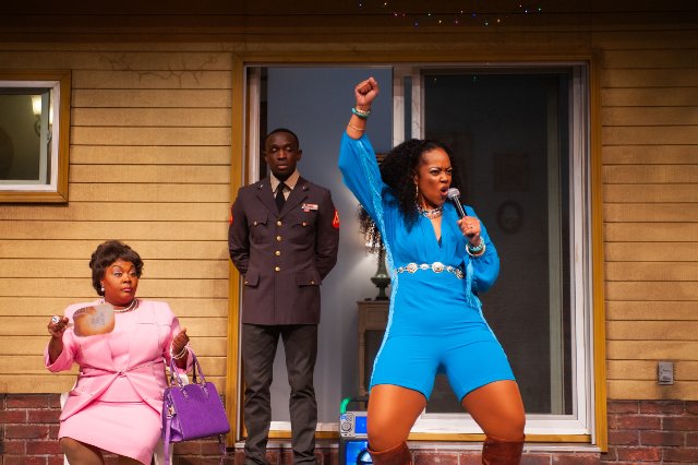 Although most of the personalities reveal themselves quickly, perhaps the greatest transformation that the playwright creates is in the person of Larry, who has little stage time. Samuel Ademola effectively plays the analogue to Laertes, Polonius’s son. A returning, uniformed Marine, he is distant and almost catatonic, but in one unpredictable action, he leaves the audience anguished, and in another, applauding.