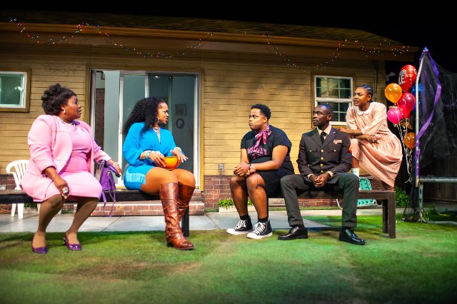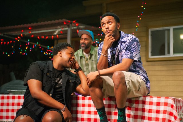 While Fat Ham has received many decorations, that doesn’t make a production an automatic slam-dunk success. It requires solid direction to ensure crack timing of the humor and great actors to deliver the lines. Happily, the San Francisco Playhouse production with Margo Hall at the directorial helm and a cast of outstanding actors deliver the goods with relish. The fine set by Nina Ball and crack lighting by Stephanie Johnson don’t hurt either.
