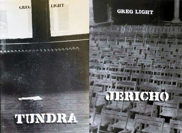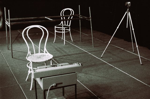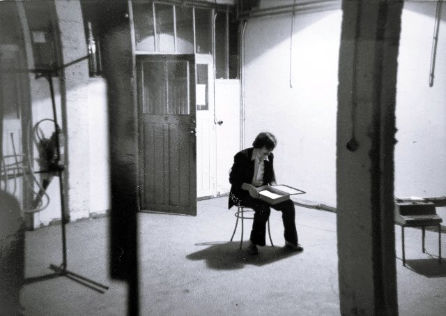 Greg: I don’t remember exploring the symbolism of the imagery very deeply at the time (not consciously), but it does appear to have permeated much of the work we were doing. Cameras, typewriters, paints, props, photos filling empty spaces and rooms became an ongoing theme. Perhaps that’s the same for all artists and writers. Filling the void with something. The two covers which you designed for my poetry books were of completely empty rooms and a large theatrical space of empty chairs. In my plays and in many of your paintings, emptiness was a persistent theme. Words and pictures filled them. The set of Black to Black consisted of just a black metal table with no top, a white metal chair with no seat, a camera on a tripod, and a large electric typewriter. The set of One Day in May was just a pile of thick ropes and hundreds of rags with which the actors constructed the different spaces they lived in very much alone. The most dramatic empty space that we staged Black to Black in was at the Farideh Cadot Galerie; her second space. At 11 Rue du Jura. She called L’Espace 13. Maybe because it was in the 13th arrondissement. It was an ominous, large, abandoned office or apartment with dark empty rooms which she had rented or was temporarily given to exhibit art and performance pieces beyond the usual paintings and sculptures of her contemporary gallery. It looked like it was on the verge of being torn down. The individual props were in different rooms and the audience followed me around as I performed.