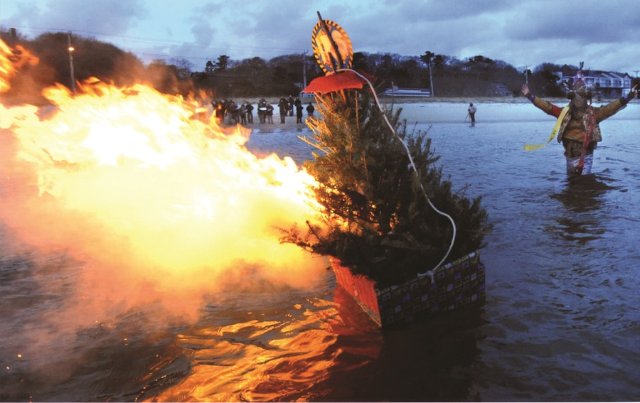 The event has evolved into a ritual Valhalla burial for a single recycled tree. Jay fashions a rustic boat which with a communal participation is dragged to the beach. In ritual garb Jay leads onlookers in chants. The boat and its cargo is pulled into the water and set ablaze.