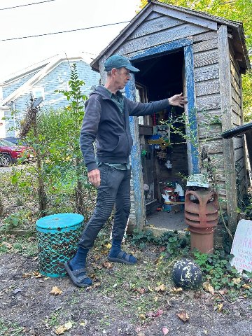 Deftly he guided us through the points of interest. A salvaged double seated out house is now a gallery. There were recycled Christmas trees, a grotto, the slowly deteriorating sand car with some of its original veneer. The highlight is a repurposed former cesspool. It has been modified as rental property.