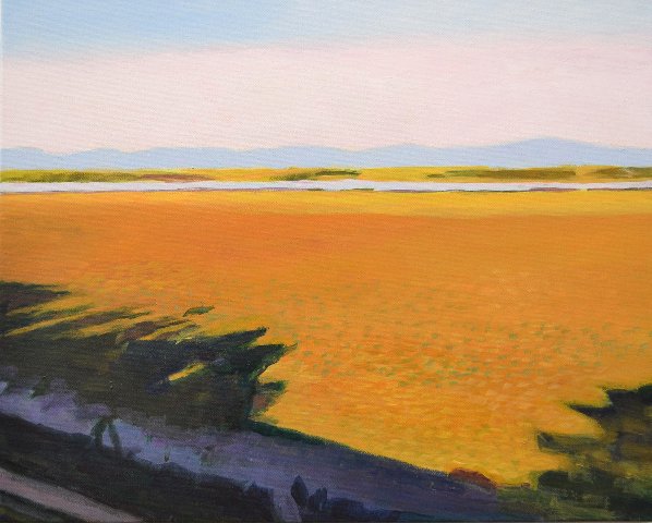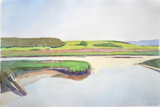 Sutro’s work expresses patterns and rhythms of the natural world, especially the vast expanses of river she experienced living in Thailand and Bangladesh, and ocean inlets and marshes on US East and West coasts. Her acrylic and watercolor landscape paintings at Gallery North are filled with abstract marks and washes of color vividly representing nature. Bands of paint shimmer and overlap, suggesting movement and light on water. Passages of color contrast and dissolve into the atmosphere of late day sunlight and heat.