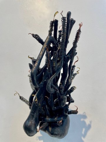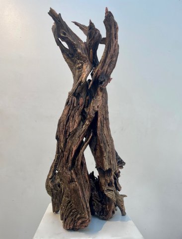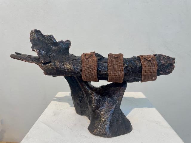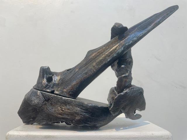 Boston Sculptors Gallery presents Leslie Wilcox’s solo exhibition FIREBRANDS, the third in a series of shows contending with the cascading global climate catastrophe. Working with weather-beaten driftwood from the beach and forest, Wilcox petrifies, gilds, and patinas the wood before adding metal screening, providing a protective armament against further damage and destruction.