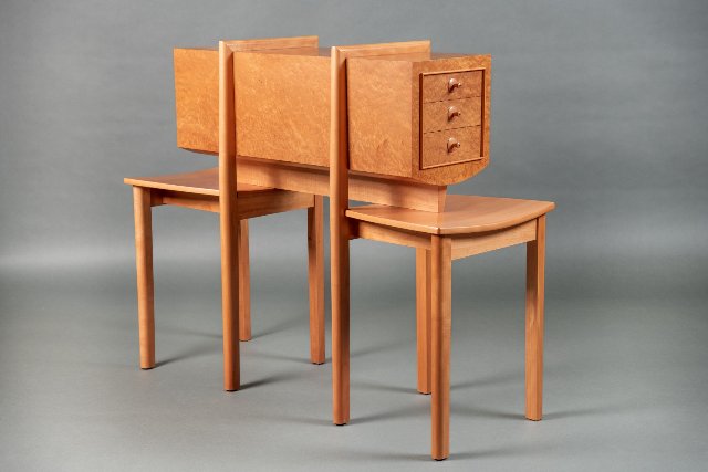 The exhibition will showcase twelve new objects, encompassing Dunnigan's signature elegant chairs and intricately crafted cabinets with chair-based structures. Dunnigan's work often reflects on contemporary issues, as seen in pieces like the "Rising Water Chairs," a response to climate change, with white-painted chairs and gray-painted feet symbolizing rising water levels. Another notable piece, the "Wildfire Loveseat," contrasts classical form with upholstery reminiscent of burnt embers, a reflection on the California wildfires. A hallmark of Dunnigan's artistry is his sensitive use of a wide range of beautifully figured woods. From the warmth of beech to the richness of walnut and the exotic tones of imbuia, Dunnigan selects woods that enhance the inherent beauty and character of each piece. Adding to their significance, each object in the exhibition is one-of-a-kind, a testament to Dunnigan's meticulous craftsmanship and artistic vision. This uniqueness underscores the value of these pieces as both functional furniture and works of art.