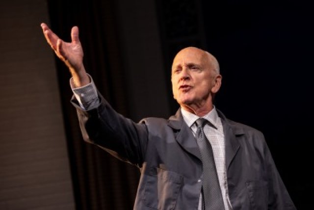 The veteran actor commands the full range of the stage with peripatetic motion and frenetic emotion. He has a broad vocabulary of punctuating gestures and actions. That allows for a lively articulation that bogs down and drags at times burdened with such massive swaths of history as well as glimpses of his private life.