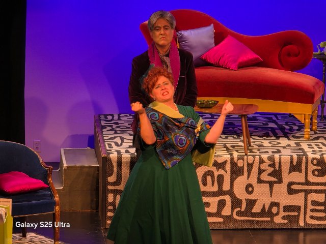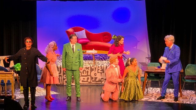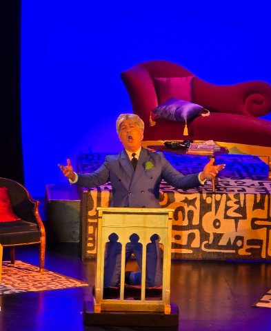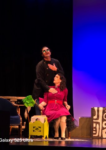 In addition to the shining music, hammy acting makes this piece work. Several riotous, chaotic ensembles integrate both performance components, contributing to the brightness. Finally, staging plays a key role. Stage Director Nicolas A. Garcia deserves kudos for integrating the pieces into a brilliant whole. He has also designed the costumes, while Daniel Yelen created the scenery. The well-coordinated palette of clothing and furnishing, dominated by gleaming, solid colors provide more cheer.