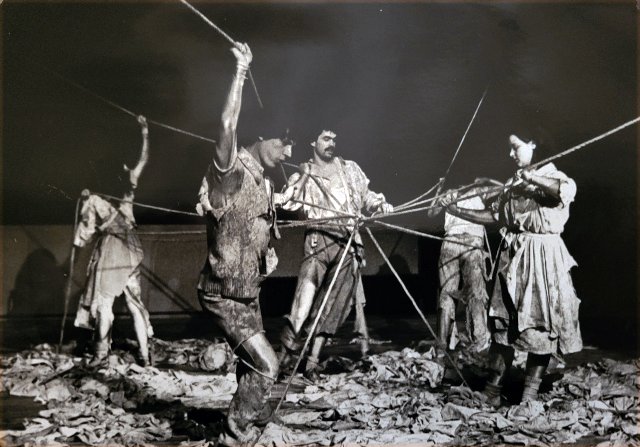 Greg: It was a superb set design. Not only were the ropes and rags visually striking, they also permitted the actors to build unique shapes and environments during the performance, ever changing spaces to augment the play’s words and actions. The play was a series of interconnected monodialogues—dialogues in which only one side is heard—which gave the actors spatial freedom to explore the characters and their language within an immediate and tactile series of developing and collapsing, growing, and decaying environments of rags. It was also a practical and easy set to transport. It filled the stage for pennies. I remember you insisting that it had to be cheap and trouble free from the very beginning. And it was.