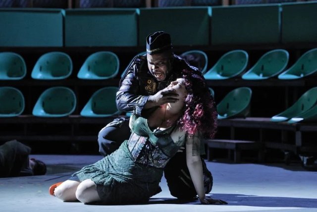 Tanya Orellana’s staging is unusual, with two concentric arcs of plain, light blue-green chairs dominating the set. The concept is that the stage mirrors the seating of the opera house. We are looking at ourselves, so the events on stage then represent the audience. Although the theme of art imitating life appeals, this particular instance is somewhat disturbing, as the characters in the opera dwell in the netherworld of society. This may be how Berg saw the world around him, and perhaps he would see our world today in the same way as the director seems to imply with this interpretation.