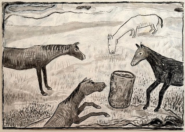 The two India ink drawings, Feeding and Fighting, are commentary on two problems in the world: getting enough to eat, and war.