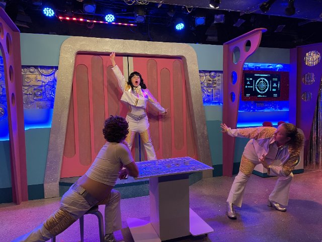 Set and costume designer Andrew Rodriguez-Triana has created a sleek, high-tech playing space that immediately suggests science fiction. Sliding doors, a toy-like robot, video screens, and machinery-like devices signal the futuristic world, while tinsel-strip curtains add a festive, slightly campy vibe. Together, the design combines sophistication with playfulness, preparing audiences for a colorful, upbeat ride.