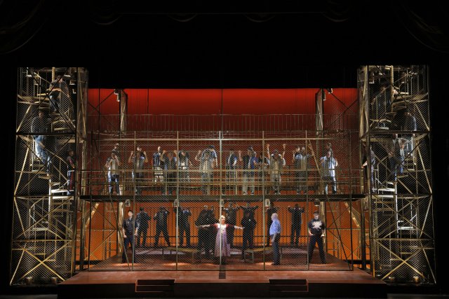 Central to the stellar staging is the steely prison set. Its daunting mobile components - catwalk, chain link fencing, and circular staircase towers are disturbing evocations of life behind bars, and dramatic lighting accentuates the isolation of prison existence. But all of the scenery gives a strong sense of place, even the occasional fragmentary sets or the projection-based views of rural Louisiana when Sister Helen first drives to Angola Prison.