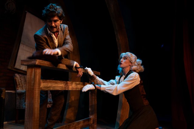 Deft comic timing and seemingly boundless energy define NCP’s memorable mounting, thanks to Tallman and her abundantly talented four-performer cast. Brandon Campbell as Hannay, Camille Schiavone as the three women who cross his path, and Rayner Gabriel and Kalen Edean as Clown 1 and Clown 2 deliver a master class in comic acting. You marvel as the performers seamlessly segue from one character to another, with lightning-fast quick changes happening in view and offstage. Between them, they portray what feels like hundreds of characters—and hardly miss a beat. The energy never sags, and the performers convincingly inhabit each role, though at times their accents make it a challenge to catch every word.