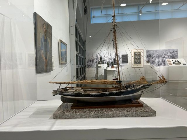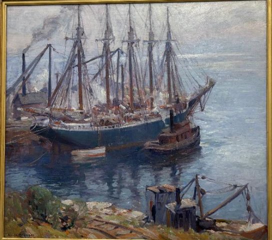 Once taken from the quarry there are works that focus on shaping the material into paving stones which were used all over America. We encounter a model of a sloop as well as a singular bravura painting of a five-masted schooner by the master Emile Gruppe.