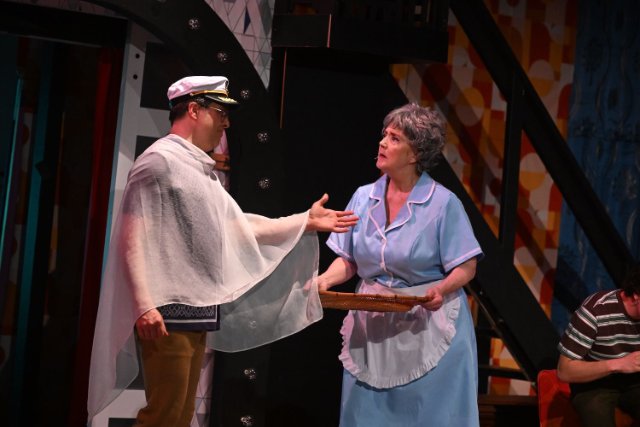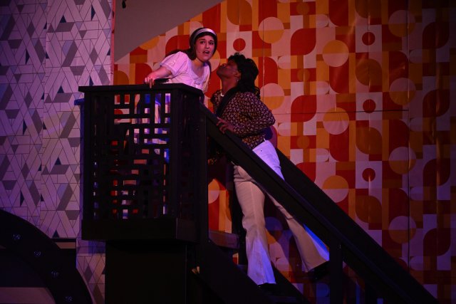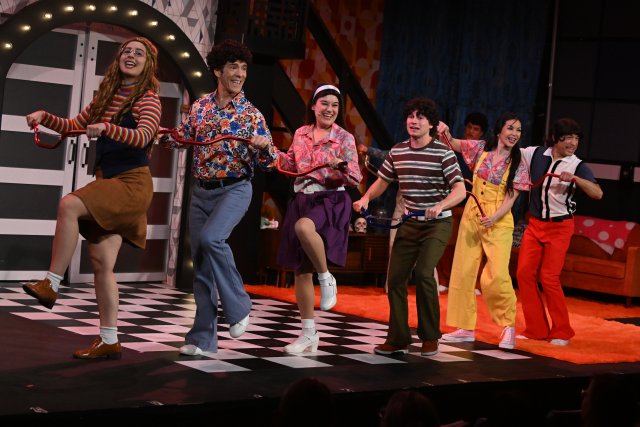 Director Scott Evan Guggenheim keeps the action moving on a stage that divides the two families onto respective sides of the stage. The staging cleverly serves many purposes, with the special visual attraction being the Partridge family’s bus in the style of a Mondrian painting.