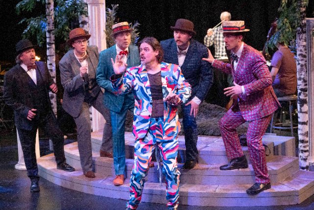 A Midsummer Night’s Dream is full of humorous possibilities that rely on interpretation and fulfillment. Here we must shed light on multi-talented factotum (borrowing from Figaro) Nicolas Garcia, the general director of the company. He stage directs this production, extracting wonderfully expressive and nuanced performances from the cast and guiding the complex movement. He also designed the lively costumes from the pastel jump-suit-like outfits of the soprano-driven fairy chorus to the gaudy plaid suits of the rustic actors.