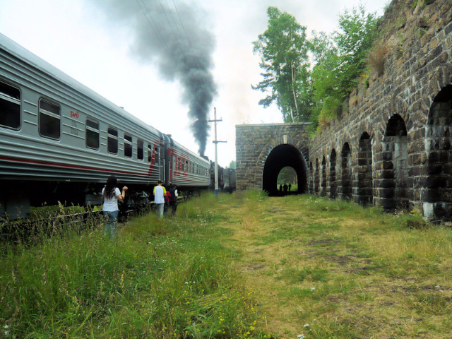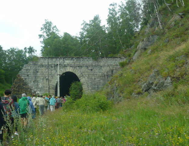 Leaving at 10 am, we traveled by vintage steam train, operated by the state, on the Circum-Baikal Railway, constructed 100 years ago as part of the Trans-Siberian Railway and now used for sightseeing tours. Convicts and exiles were involved in its construction, considered an engineering feat of its time due to the difficult geological and climatic conditions. As we listened to an English-speaking Russian guide on board, we traveled along the coastal precipice, passing by forests, mountain rivers, picturesque valleys, enticing bays, and settlements with wooden houses. We stopped periodically to walk along the railway bed, admiring field flowers and passing over narrow bridges and through cool tunnels with galleries built to prevent landslides.