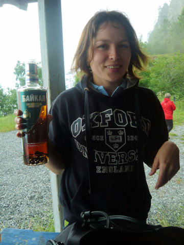 Back on the train we continued to Kirkirej, where we stopped to try Baikal brand vodka, which is made with water from the lake, high in oxygen. Of the variety of Baikal vodkas, we tried one that looked like brandy, the dark color attained by adding pine nuts or pistachios during bottling. We then participated in a Buryat-style blessing ceremony, following the only man in our group as he, head covered, led us by the river in a clockwise motion, while emptying a bottle of vodka onto the ground to protect us from ill fortune.