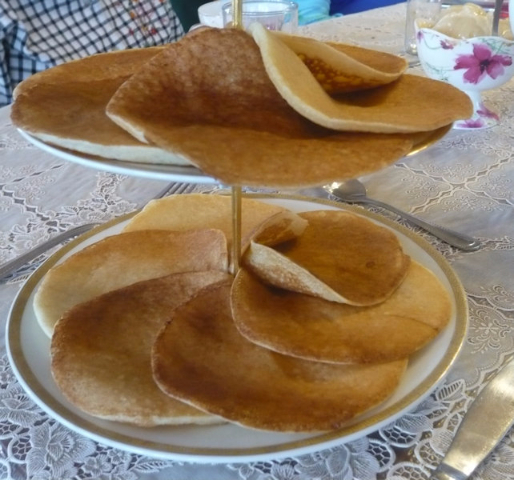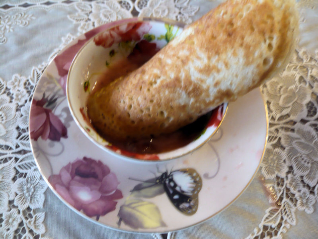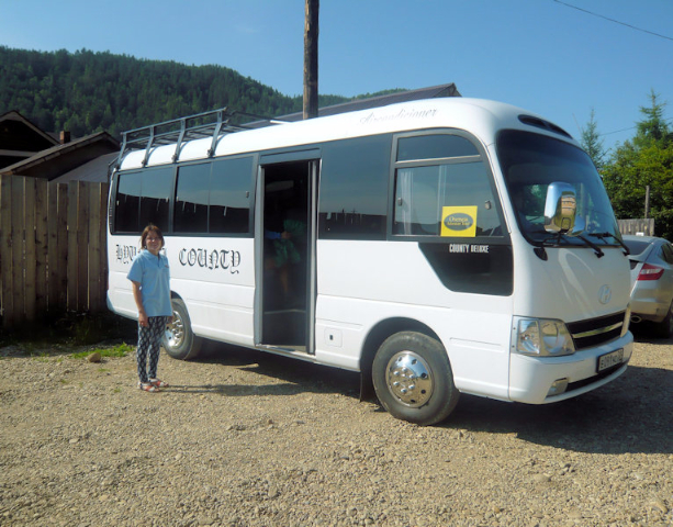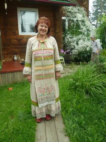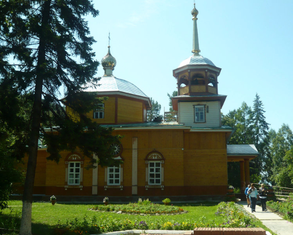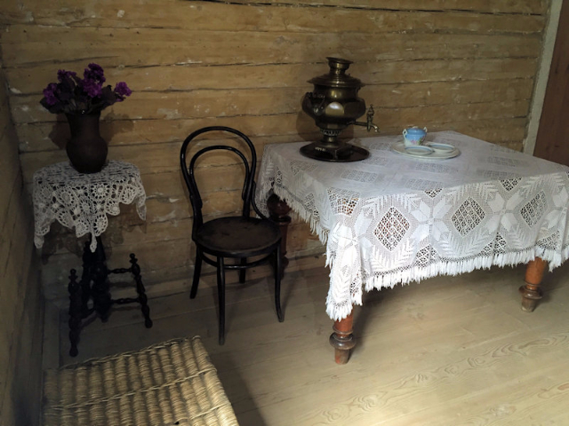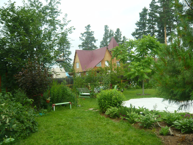 Entering the house through a sun room, we reached the interior, which had all hand-crafted furniture, and settled around a beautifully set luncheon table. Salads of garden-grown tomatoes, cucumbers, and cabbage were already set on the table, along with home-made dark bread. The three-course meal began with mushroom soup, followed by meatballs and potatoes, and ended with a dessert of thin blini pancakes served on a three-tiered platter. We rolled up each pancake, then dipped it in a mixture of raw honey and home-made raspberry jam. The delicious dessert was accompanied by tea brewed from herbs and berries grown in the garden. I parted with great admiration for this family, having learned over lunch that the grandparents had arrived in Siberia from Belarus in shackles; the details of the story they preferred not to share.