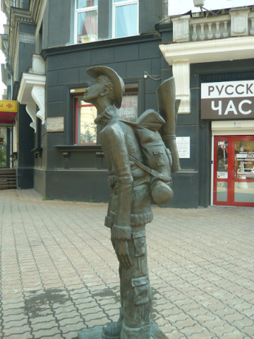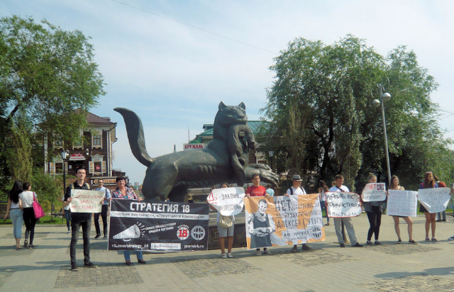 Babr the Siberian tiger is the symbol of Irkutsk, appearing on the city’s coat of arms. The tiger, whose name means “snow leopard” in Buryat, stands as a massive bronze sculpture with the tail and paws of a beaver, holding a sable in his mouth, at the entrance to Kvartal 130, a pedestrian street of renovated 17th and 18th-century wooden buildings now used as pubs, cafes, and shops. People in this renovated part of town line up to touch the paws of Babr for good luck. On the day of our visit there was a demonstration in front of the sculpture against Strategy 18, which is a plan for the production of gas in the Irkutsk area by the state oil company Gazprom. Already completed in western Siberia, gas production is moving eastward in order to expand the market to China and east Asian countries.