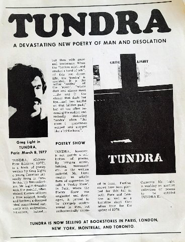 Greg: With Bentley, we started our own press. I collected some of those first poems, plus some new ones under the name Tundra; they were the first thing we published. A first (and only) run of 500—naïve optimism. I still have many left, but at 500 the unit price of the run dropped significantly. Thank God for Leroy. You designed the cover. A dark photo of an empty room. A chambre de bonne?