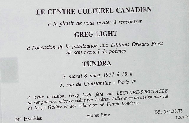 Greg: Our press and Tundra helped me to secure my next performance; at the Centre Culturel Canadien. You designed, Bentley directed, and Vince worked the lights. By then, I was not memorizing dots quite so intensely. It was a wonderful venue with a small theatre and gallery space and sizable membership list. Back then it was located at 5 Rue de Constantine in the seventh arrondissement. Very up market district, near Les Invalides. Amazing luck that they even listened to us. I had virtually no history, but based on a book of poems, a performance philosophy, youth and exuberance, (and being Canadian), they gave me a date. And they billed it as a performance and book launch. So, I sold quite a few copies to boot.