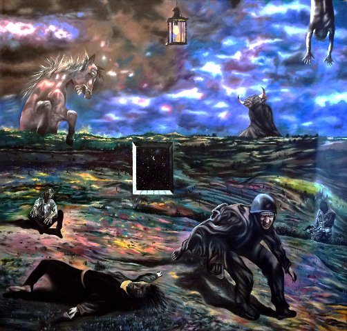 You would have to know the work well to identify the source of Mahdavi’s interpretation. There is none of Picasso’s grisaille, agonized, horrific cubism. The composition of the foreboding landscape could not be more different. The dominant figure is a crouching soldier with the artist’s features. To his left is a corpse. Picasso’s signifying horse and bull hover on the horizon. From above is a lantern, referencing Guernica’s and a falling figure.