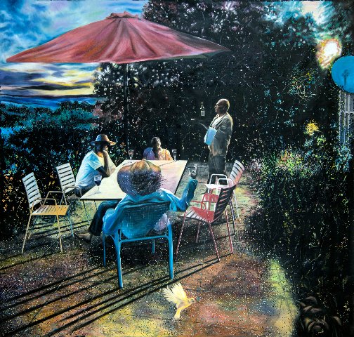 He has taken the greatest liberties with his interpretation of Hopper. The film noir scenario has been relocated from an austere, 1940s generic, urban diner to a bucolic, plein air setting. While wonderfully fresh and inventive, arguably, it seems more French impressionist than American. It’s Americana via Paris delightful evoking Renoir’s Luncheon of the Boating Party, from the Phillips Collection, rather than Sam Spade and a moll hunkered down over a cuppah joe.