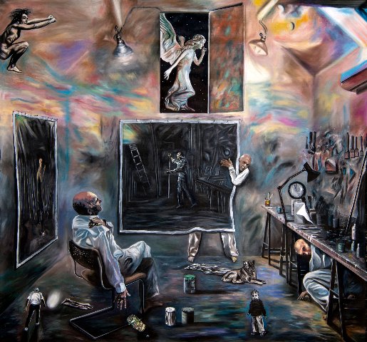 In Shelf Life, like Velasquez, he depicts himself seated in the studio. But he, rather than a princess, is the central focus. A glass has fallen from his hand seemingly startled by the apparition of an angel, likely of death. The painting is fleshed out with signifiers from Velazquez as well as his doppelganger under a studio table.