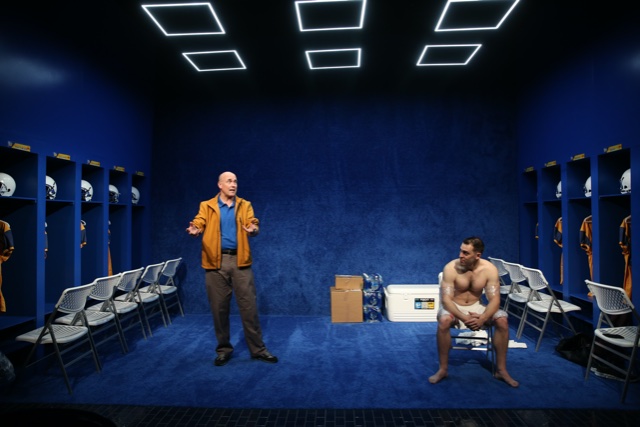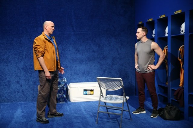 Football hero George Berri rises when his coach, Bill Fitzgerald (Larry Bull) enters the room to unfold the players chairs before they arrive.