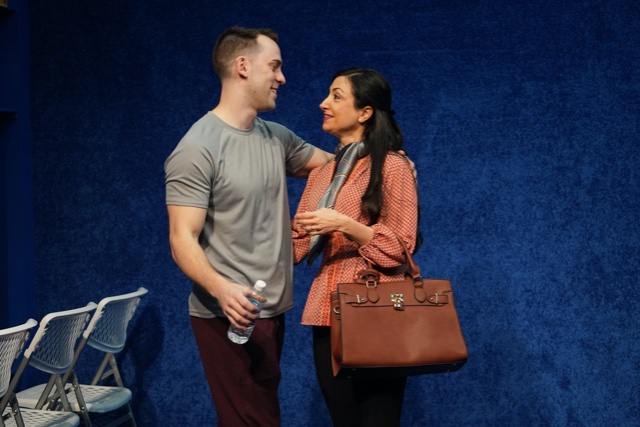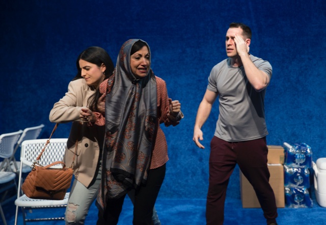 George and his mother speak in English and Arabic. Sometimes Arabic is translated in supertitles on the wall behind us. When it is not, we still get the gist of the conversation from tones of voice and body language. His friend and manager Marina is also an Arab American Muslim, but she grew up in an isolated community near the edges of Dearborn, Michigan and became a Christian. Olivia AbiAssi as Marina dances on a dime as she tries to defend her American Arab Muslim-ness.