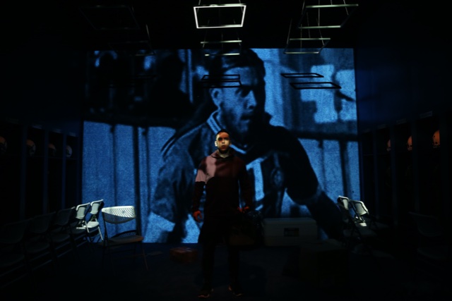 First Down opens in a football locker room, hallowed ground. Here a man faces east in prayer, seeming to follow Al-Baqarah: “So from wherever you go out [for prayer, O Muhammad], turn your face toward al-Masjid al-arm, and indeed, it is the truth from your Lord. And Allah is not unaware of what you do.” The locker room as mosque? Not quite, but maybe the Superbowl football field tomorrow will be.