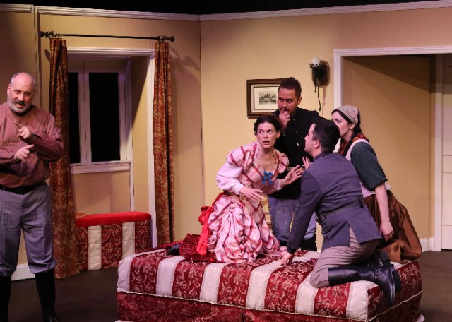 Kudos to Diane McRice’s staging, which involves a single set-frame which is amended and accessorized as three different locations.  One matter prompts comment only because of the Director’s Note in the program.  Apparently, the word ottoman appears in the stage directions 27 times but never in the dialog.  What appears to be a day bed centers the stage in Act 3.  While it could be characterized as a mammoth ottoman, virtually anyone’s vision of that apparatus is as an overgrown, symmetrical foot rest, and this representation doesn’t work.  The significance of the word is that Bulgaria was subjugated by the Ottoman Empire when the play was written and would not achieve independence until 1908.