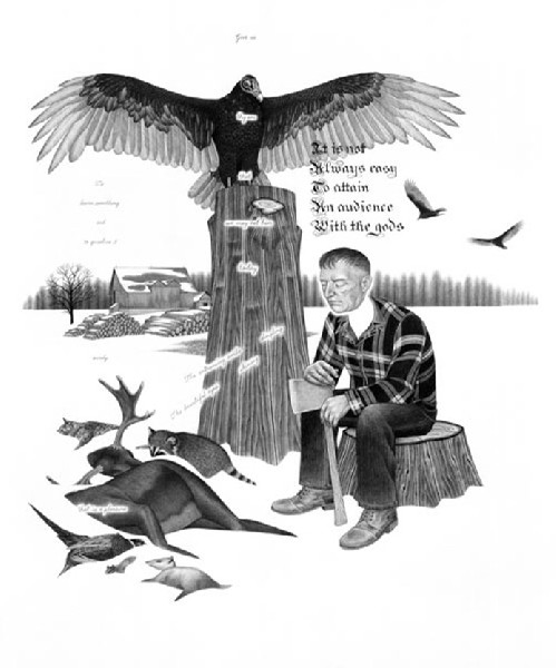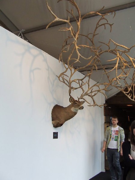 Our strategy for walking the fairs was to do a quick run through and then return to the galleries that carried work that was particularly interesting. One of the highlights from the show was a series of gorgeous drawings at Morgan Lehman Gallery by Eric Beltz (and I spotted a really great little painting by Andrew Schoultz behind the desk). Other gallery highlights include Richard Heller Gallery out of Santa Monica with works by Edward del Rosario, Mixed Greens Gallery of NYC with Alessandra Exposito's exquisitely painted animal skulls and PPOW with a lovely little series by Dottie Attie and the incomparable Julie Heffernan at Catherine Clark Gallery. Heffernan's paintings are luscious psychological dramas, frequently self portraiture with sweeping dreamlike compositions that are reminiscent of traditional Dutch genre tradition in their excess.