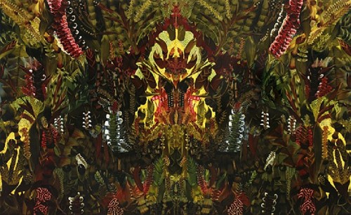 Our next stop was Volta (the ugly kid sister of the Armory Show) which had a strange energy seemingly fueled by a desire to be cooler than the office building context in which it is housed. Silly sights included a topless woman directing patrons as they rummaged through a pile of yarn looking for $500 necklaces (Golden Ghost by Surasi Kusolwong), an installation by Alejandro Diaz that consisted mostly of pieces of cardboard crudely lettered with magic marker, and an installation involving plants that one was instructed to direct negative thoughts towards. None of this was particularly compelling. Volta was also the site of a number of examples of the "flavor of the month" which right now seems to be either macramé (guns, hammocks, etc), neon text in various configurations, and China (military, peasant worker or tweaked silk paintings). On a positive note, Andy Harper's intensely layered paintings, which loosely reference hyper-detailed images of vegetation, were hypnotic and worth spending time with.