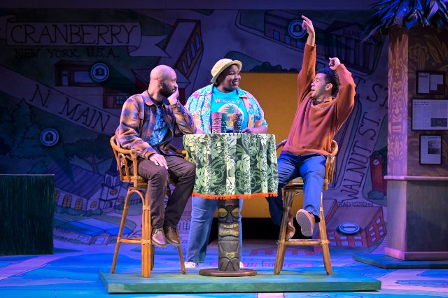 A unique contribution to the context of Primary Trust is Christopher Fitzer’s striking scenic design. A cartoon map of the center of town appears as a huge scroll that begins on the backwall, reaches across the stage, and flows over its front lip. References to the two banks, two bars, and so on are even pointed out on the map. While the function elements of the bar and office staging are minimalistic, the framing creates a small-town feel that connects to the themes of the play.
