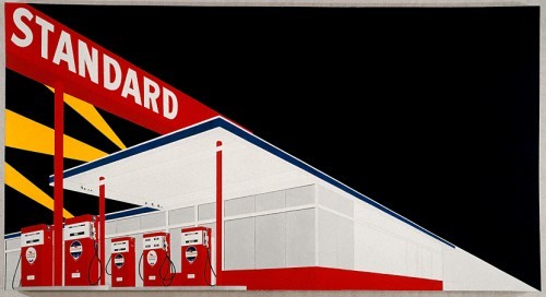 Leaving behind the messy collages and assemblages, we moved on to see pictures of pretty young men and outdoor swimming pools by David Hockney and waves by Veja Clemens. Llyn Foulkes and Joe Goode seemed to be the California response to East Coast Pop Art. With Billy Al Bengston and Ed Ruscha, both of whom are somewhat Pop, we became aware we were entering rooms of paintings with smooth surfaces. Wall labels began to introduce the term “finish fetish.”