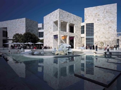 But Day #1 is not over. We then drove on to the J. Paul Getty Museum at the Getty Center—that elegant collection of luminous architectural forms you can see from the San Diego Freeway (405)—high in the hills of the Santa Monica Mountains overlooking the Pacific Ocean. We parked in the Getty’s lot half-way up the hill, and I took the tram (Brad ran up for the exercise) to the plaza, the central space of Richard Meier’s Getty Center. It was like stepping through Bernini’s Arcade into the Piazza in front of St. Peter’s in Rome. What a fabulous set of interpenetrating forms and spaces!