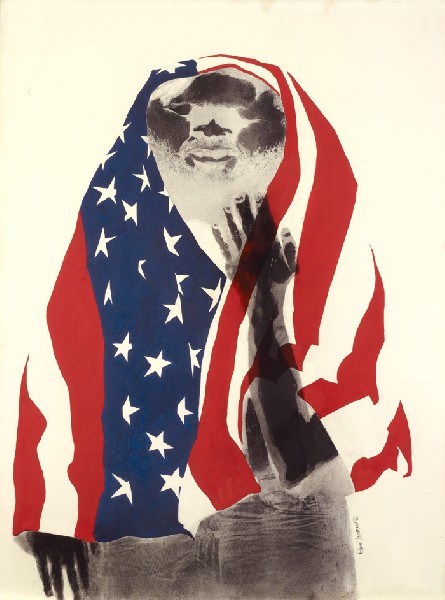 Hammons, Edwards, and Saar were shown in depth, as were Outterbridge’s powerful sculptural reliefs and stuffed fabric human forms. Johnson’s black wooden boxes with the faces of black-painted dolls peeping out through holes were compellingly political, as was Purifoy’s 24 x 24 x 6 inch lump of charred remains of who-knows-what, titled Watts Uprising Remains. Riddle’s constructivist scrap-metal sculptures consist of an amalgam of shaped metal with recognizable elements of human forms welded together with abstract fragments. Gradual Troop Withdrawal of 1970 includes one sculpted trousered leg and shoe linked to a skeletal hand; the “figure” swoops backwards, off-balance, vulnerable, and damaged—a strong metaphor for psychologically impaired, returning soldiers.
