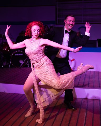 The female lead is nightclub singer Reno Sweeney, who knew Billy before the cruise and had a crush on him. Performed by a compelling Seana Nicol, she possesses a strong singing voice and acting chops, and like Jaochico, has charisma that suits the role. Individually and together, they give fine renditions to the Porter tunes, but one weakness is Act 2’s “All Through the Night,” in which the orchestra arrangement overpowers the singing in what should be a very understated backing. Nonetheless, the decision to have Music Director Armando Fox and the other six musicians on stage and in uniforms creates the feeling of a shipboard orchestra and otherwise works well.
