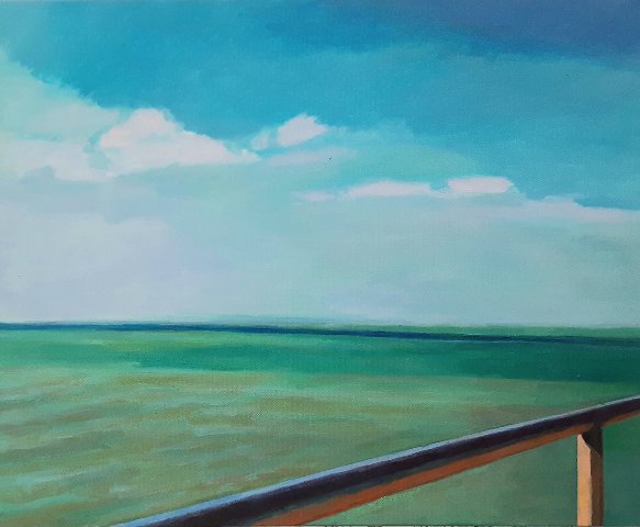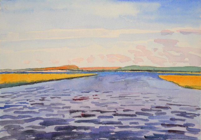 Sutro’s work expresses patterns and rhythms of the natural world, especially the vast expanses of river she experienced living in Thailand and Bangladesh, and ocean inlets and marshes on US East and West coasts. Her acrylic and watercolor landscape paintings at Gallery North are filled with abstract marks and washes of color vividly representing nature. Bands of paint shimmer and overlap, suggesting movement and light on water. Passages of color contrast and dissolve into the atmosphere of late day sunlight and heat.