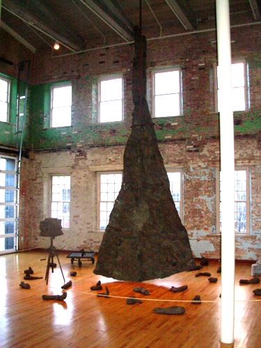 After Krens took me on that tour of the Sprague campus we settled in his office to discuss his vision to develop Mass MoCA. He described the availability of large scale minimalist works sitting in warehouses because museums and collectors had no space to display them. These large works, primarily sculptures fabricated from commercial construction materials such as plywood and steel, require little or no conservation and maintenance. Why not "warehouse" these works in a site such as Mass MoCA? Because of the nature of the works the spaces would not require the expensive climate controls that are the norm for museums displaying delicate and sensitive works of art. To illustrate his point for a long time, while the museum was under construction, it displayed "sample" works such as those by the Arte Povera artist Mario Merz.