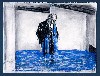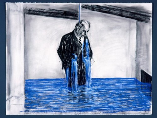 In Stereoscope (1999), while Soho sits at his desk looking at a framed photograph of his wife, she comes to life with her lover, Felix Teitelbaum. Crowds gather outside Eckstein’s house, his office building eventually disintegrates in a cloud of charcoal dust and Soho, head bowed, stands alone in a room. Kentridge’s blue stream lines begins as sound lines that connect the quickening pace of telephone ringing, cat screeching, wheels turning and churning that, in the process, cause a tower to fall down. They soon change when the inconsolable Soho, sobbing, finds himself standing in a rising bright blue pool of his own sadness and grief. The sound spurts of bright blue are now transformed to suggest water – a reprise against affliction but also tears.
