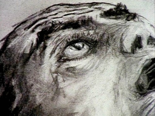 Since the late 1970s, refusing any computerized special effects, Kentridge has concentrated on the direction of “moving pictures.” He has crafted deliberately primitive and profoundly imaginative films based entirely upon his handmade charcoal drawings and, using only a drafting table and camera, refining them gradually. Kentridge’s technique itself is not entirely unique – Oskar Fischinger made “motion paintings” and charcoal-on-paper animation as early as the 1940s, as well as Oscar Schlemmer at the Bauhaus. But, while Kentridge displays a distinctive style in his films, there is the occasional nod to other artists he admires – the films of Georges Méliès and Sergei Eisenstein, Cocteau’s “Blood of a Poet” also comes to mind, as does the famous scene in Jean-Luc Godard’s “Two or Three Things I know About Her.”