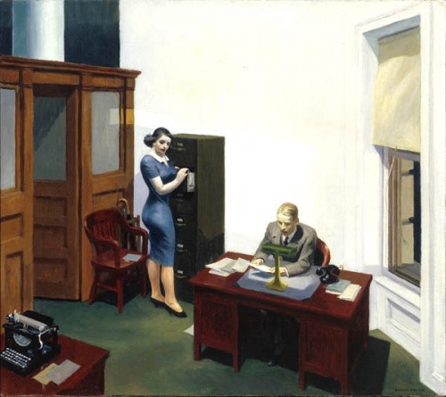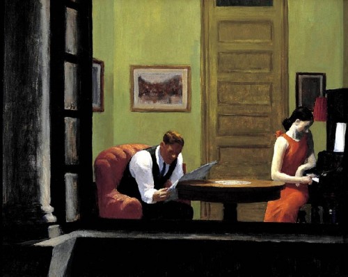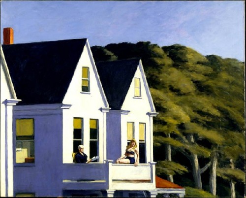 Although there are women and nudes in his work they are strangely lacking in erotic appeal. Often they are young and beautiful but trapped in mundane jobs or languishing alone at home by the windows of low rent apartments. Perhaps sitting alone or with a friend enjoying a cheap meal at a Chinese restaurant or the Automat. There is a pretty blonde woman in "New York Movie" (1939) from the Museum of Modern Art. She is every bit as beautiful as the glamorous women of the silver screen, but we see her off to the side of the movie palace. She is not the stuff of dreams but rather a pretty girl getting minimum wage during the Great Depression leaning against a wall seemingly lost in thought. Where another artist, such as Reginald Marsh, might milk this subject, the genius of Hopper was to render it in an understated manner. Again, he allows us to fill in the details using our imagination.